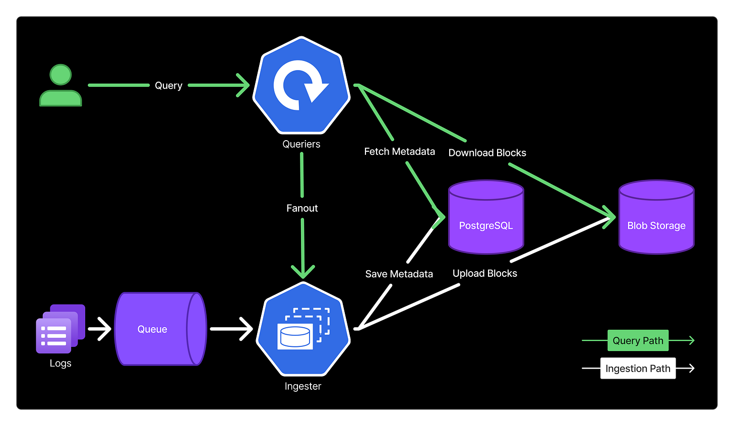 Querier: Stateless component that processes queries by fetching blocks from blob storage (or cache) and merging results. Also queries Ingesters for the most recent logs.