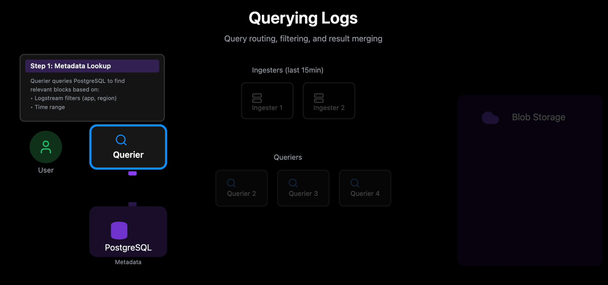 2. Query Recent Logs: The query fans out to all Ingester pods to fetch logs from the last 15 minutes that haven’t been uploaded to blob storage yet.