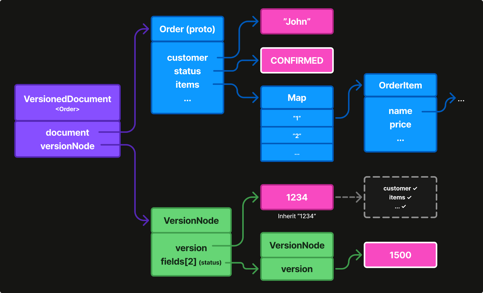 The data layer remains a clean protobuf domain object, free of any version semantics. The parallel version layer mirrors the data layer, tracking field-level modifications in a sparse tree. Fields without explicit entries inherit the base version from their parent node, providing massive memory savings for typical usage patterns like data that has many fields but only a few change over time.