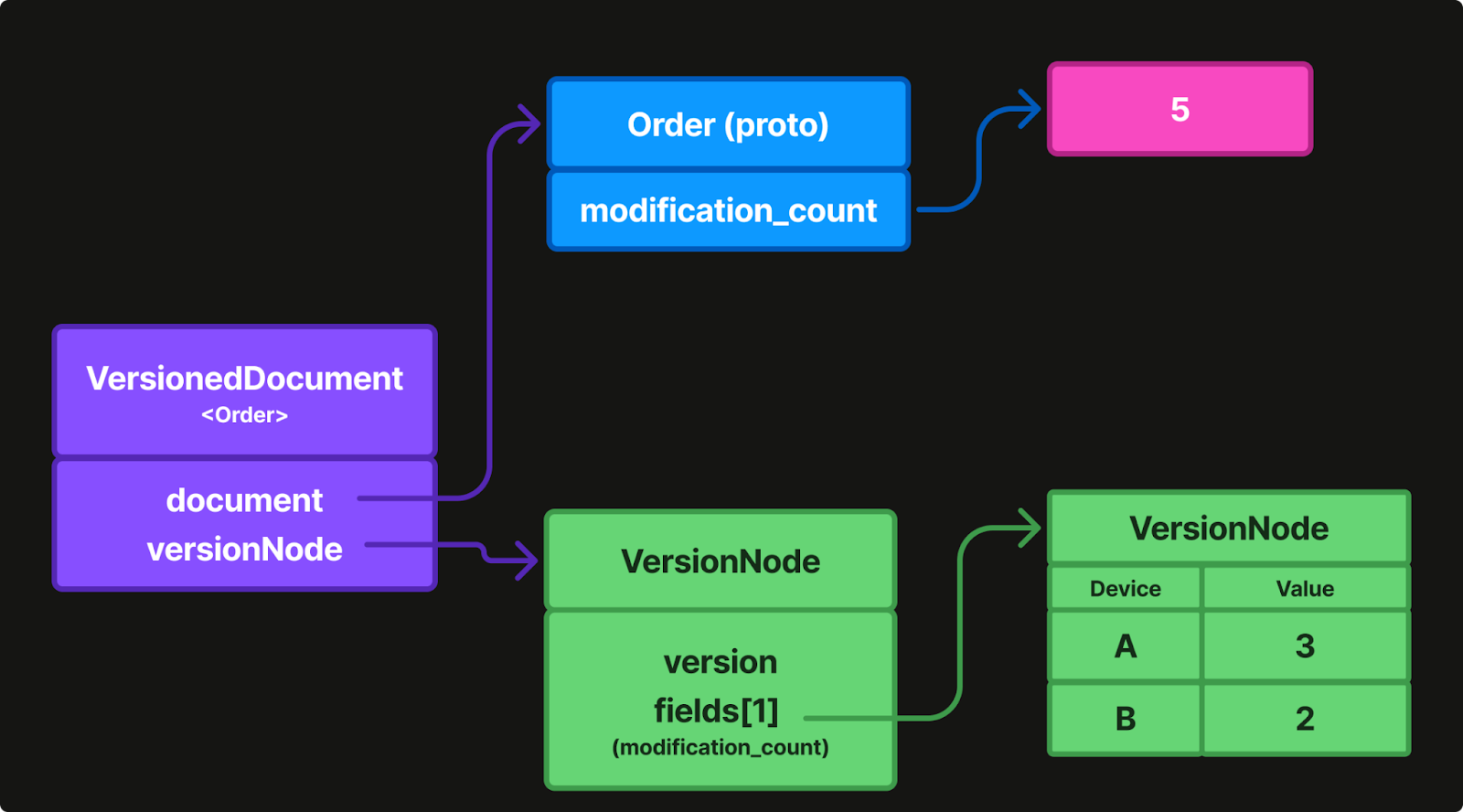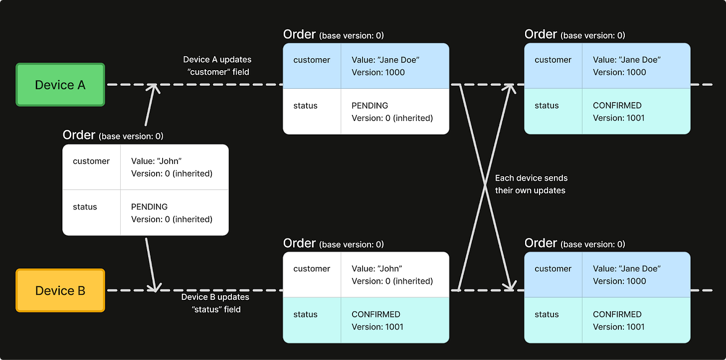 Assume we have two devices making concurrent modifications to different fields of the order protobuf. Device A updates the customer field, while device B updates the status field.
