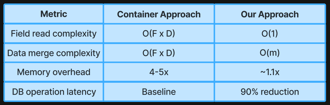 So we went back to first principles and built something different. By rethinking how version metadata relates to business data, we achieved a 90% reduction in database latency and 4x less memory overhead compared to the container-based approach that dominates the CRDT landscape.