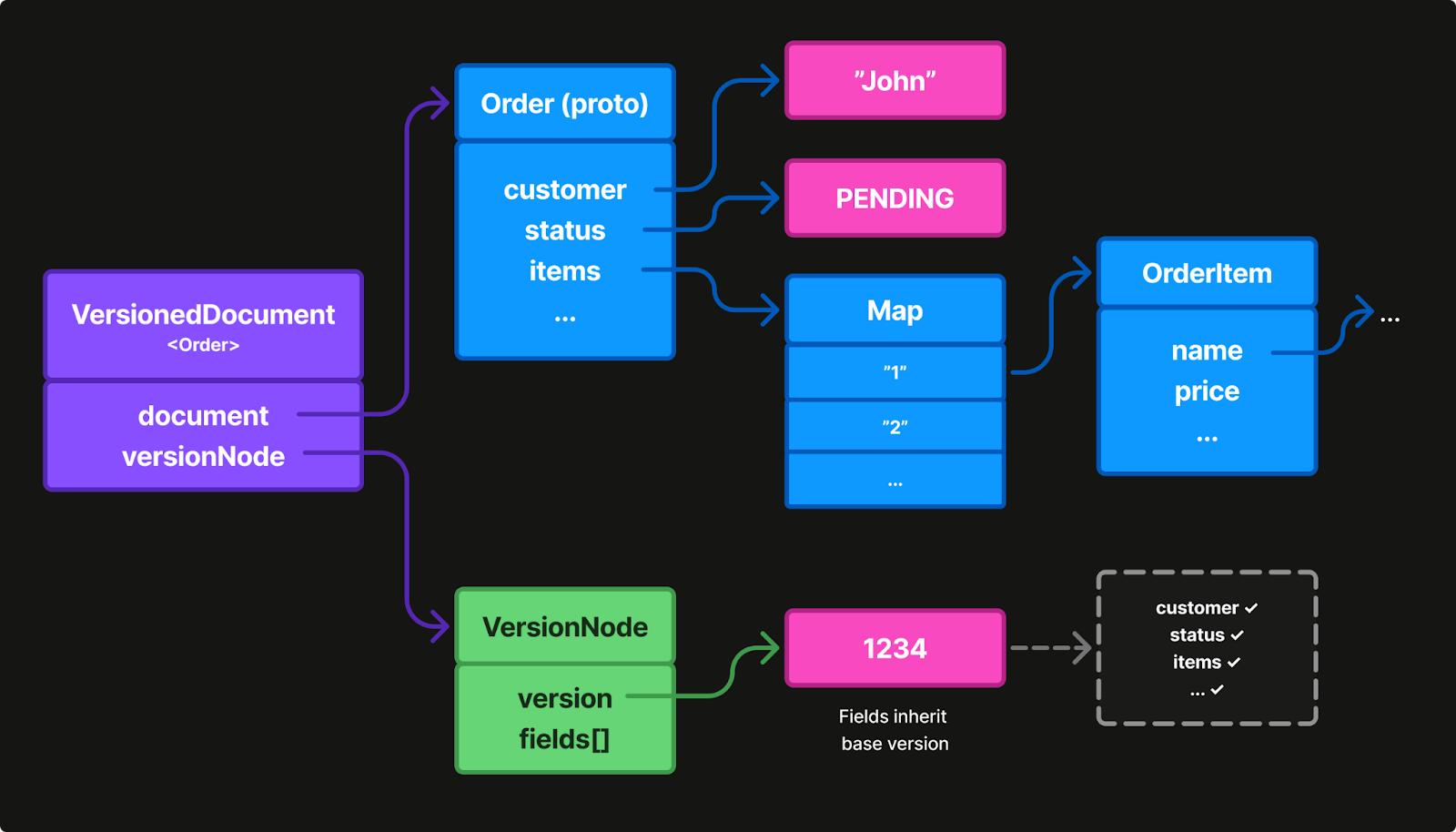 Traditional CRDT libraries embed versions within values. Our key insight: separate them instead. Maintain a parallel version tree that mirrors your data structure. Remove redundant nodes in the version tree by only storing entries for fields that differ from the base version.