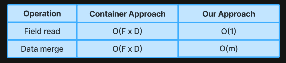However, this choice also means that we had to implement adapters to map domain object fields into generic container types. As a result, every read and write operation to the database required an O(F x D) transformation (where F is the number of fields and D is the depth).