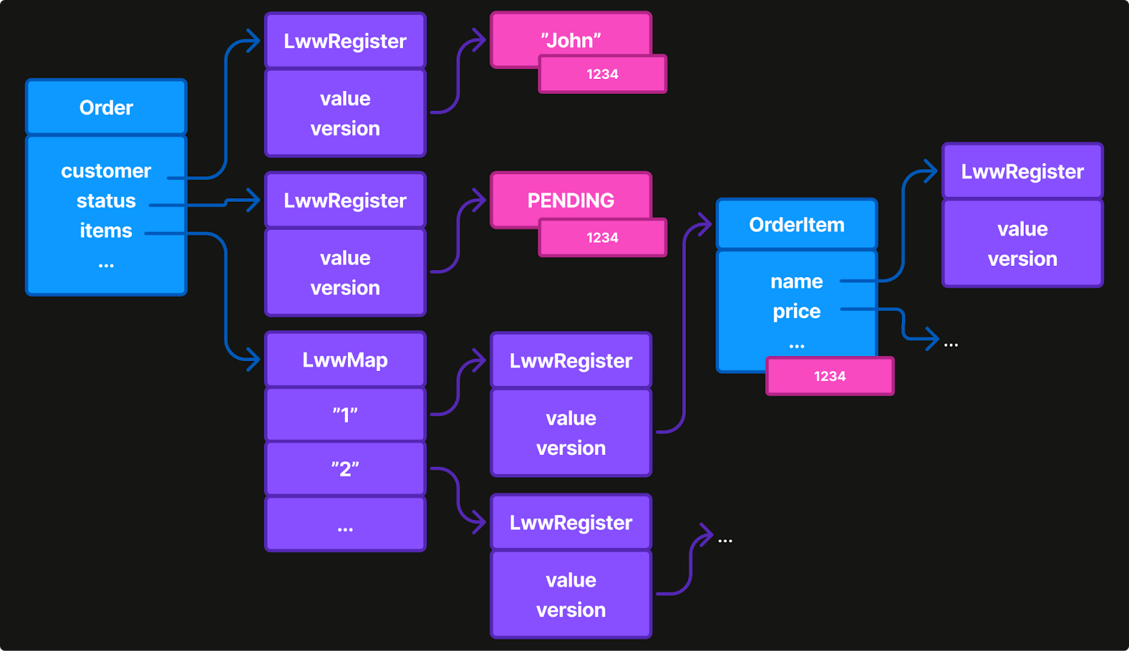 For “last-write-wins” (LWW) data types, this means wrapping both the data and its version metadata in each container. This is the approach used by Ditto, Automerge, Y-CRDT, and most open-source implementations.