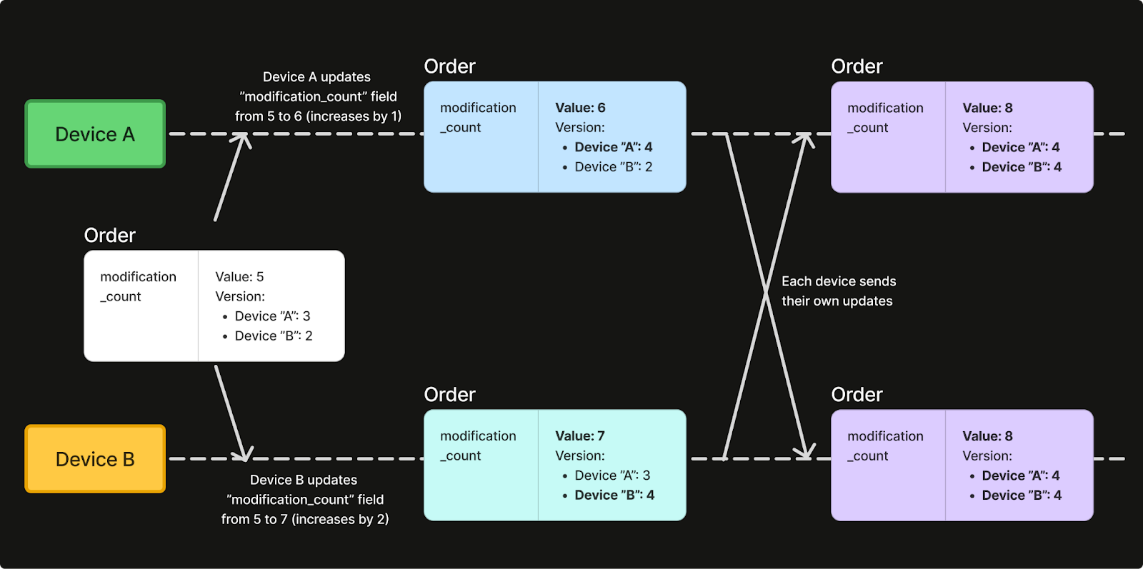 When an integer or long field is marked with the COUNTER merging strategy, a G-Counter structure is stored in the version tree. Counter fields use per-actor tracking internally so that each device’s contribution is recorded separately. The counter value is the sum of all contributions, ensuring concurrent increments never lose updates, whereas a naive last-write-wins approach would lose all but one of them.
